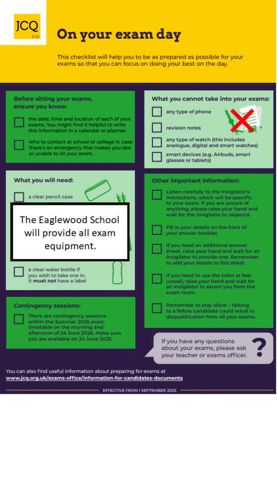 It’s important that all exam candidates read these documents prior to sitting their exams.  To request a hard copy of any of the documents or the exam policies below please contact the Exams Officer,  Mrs Lianne Allen on 01425 460994 or email: admin@eaglewoodschool.co.uk